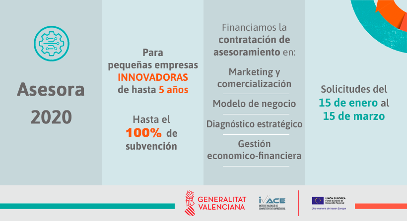Si eres una pequeña empresa innovadora con una antigüedad inferior a 5 años y estás ubicado en la Comunidad Valenciana, puedes acceder a la línea ASESORA de IVACE, que apoya el desarrollo de planes empresariales, mediante la concesión de subvenciones vinculadas a la prestación de servicios de asesoramiento especializado.