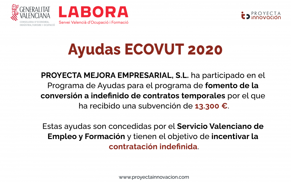 PROYECTA MEJORA EMPRESARIAL, S.L. ha participado en el Programa de Ayudas para el programa de fomento de la conversión a indefinido de contratos temporales (ECOVUT 2020) por el que ha recibido una subvención de 13.300€.