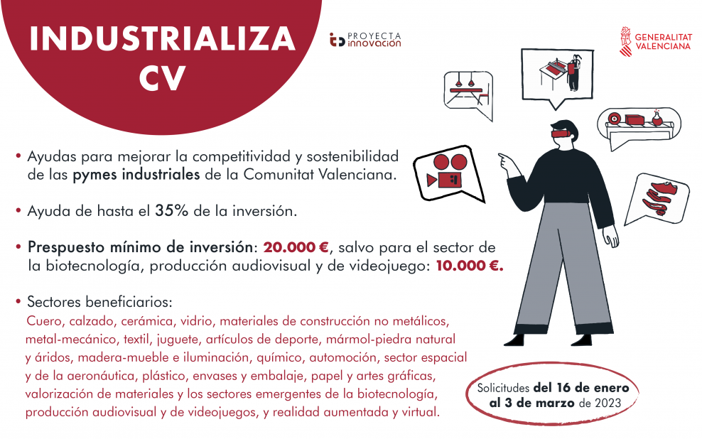 Podrán acceder a estas ayudas las Pymes que desarrollen su actividad en la Comunidad Valenciana vinculadas a los sectores de la Comunitat Valenciana del cuero, calzado, cerámica, vidrio y materiales de construcción no metálicos, metal-mecánico, textil, juguete, artículos de deporte, mármol-piedra natural y áridos, madera – mueble e iluminación, químico, automoción, sector espacial y de la aeronáutica, plástico, envases y embalaje, papel y artes gráficas, valorización de materiales y los sectores emergentes de la biotecnología, producción audiovisual y producción de videojuegos y realidad aumentada y virtual.