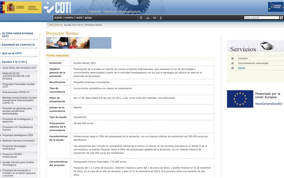 El Ministerio de Ciencia e Innovación, a través de CDTI, lanza una nueva convocatoria de Ayudas del Programa NEOTEC con 36,5 millones en subvenciones para empresas de base tecnológica.
