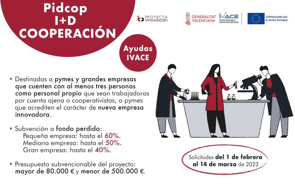El Instituto Valenciano de Competitividad Empresarial (IVACE) lanza la convocatoria de ayudas del programa Pidcop I+D en Cooperación, cofinanciado por la Unión Europea.