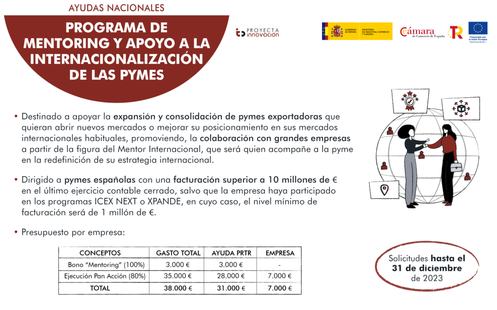 - Bono de “Mentoring” para la reactivación de la actividad internacional de la pyme: El bono tiene un valor de 3.000 euros y su coste será financiado íntegramente por el Plan de Recuperación, Transformación y Resiliencia (PRTR), siendo el derecho de cobro de éste expresamente cedido a la empresa mentora en la formalización del Acuerdo de Mentoring entre el beneficiario y la misma. La empresa mentora destinará el bono a la realización de acciones de responsabilidad social corporativa.